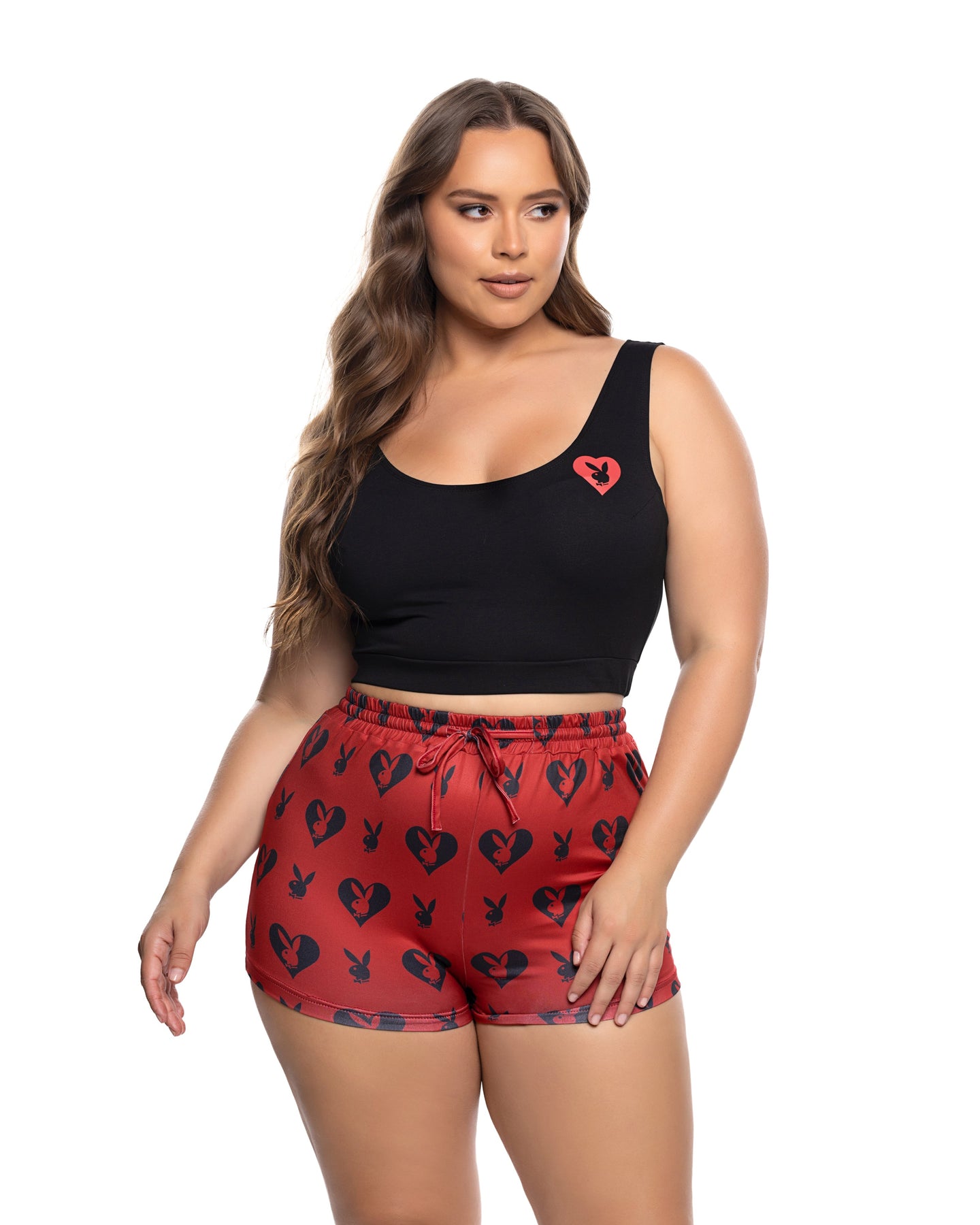Jersey knit cropped tank•Screen print bunny heart cameo print•Cozy fleece shorts•Drawstring waist